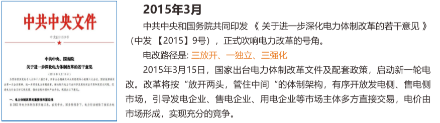 1 ? 2015年3月15日中發(fā)9號文中共中央和國務(wù)院聯(lián)合發(fā)布電改9號文,拉開電改大幕。